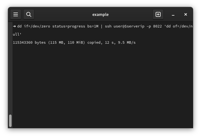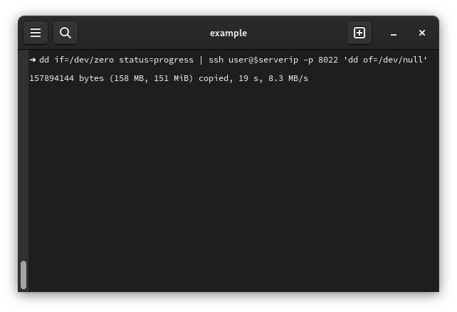 dd if=/dev/zero status=progress bs=1M count=300 | ssh user@server_ip -p 8022 'dd of=/dev/null'