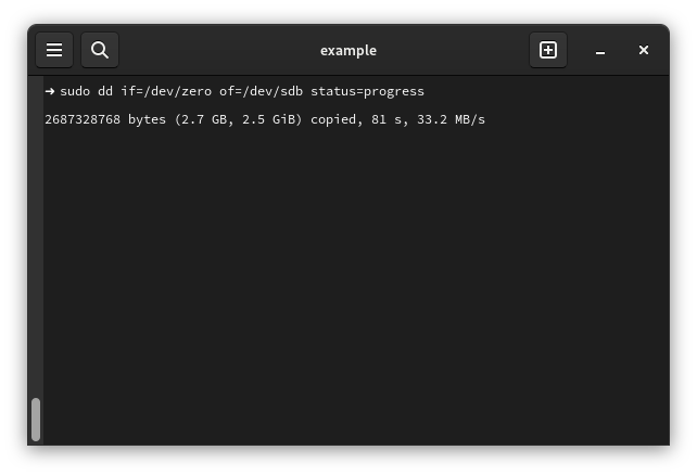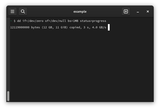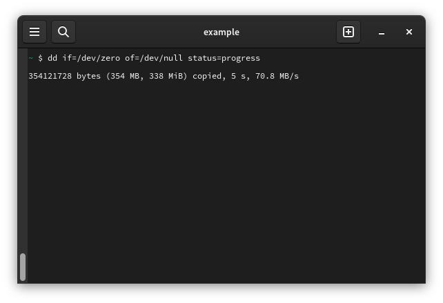 dd if=/dev/zero of=/dev/null bs=1MB status=progress