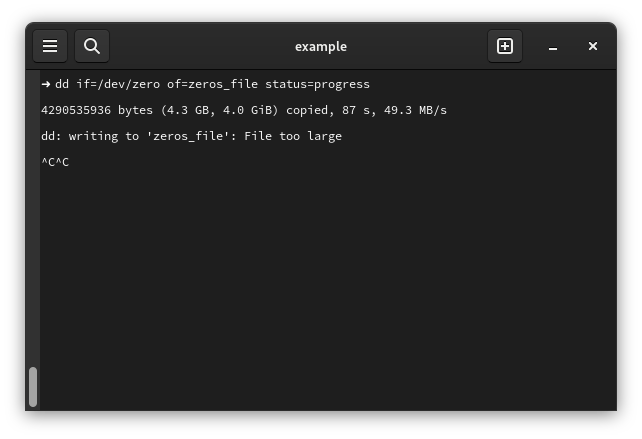 dd if=/dev/zero of=zeros_file status=progress