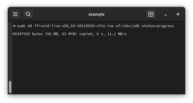 sudo dd if=<path device> of=<path of device> status=progress