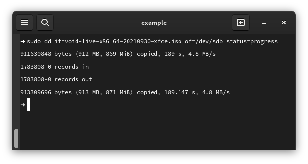 sudo dd if=<path of iso> of=<path of device> status=progress