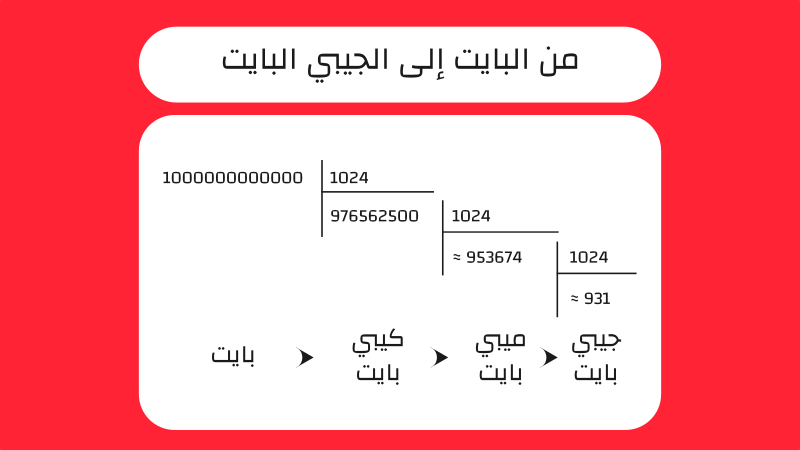 سنستنتج حينها أن 1000 جيجا بايت تساوي 931 جيبي بايت، هي إذن نفس القيمة التي قد تظهر لك في بعض حالات الاستخدام.