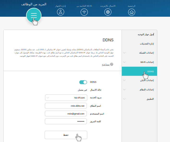 عندما يتم تغيير الـ IP ، يرسل جهاز الراوتر الـ IP الجديد إلى اسم المضيف rn0x.ddns.net