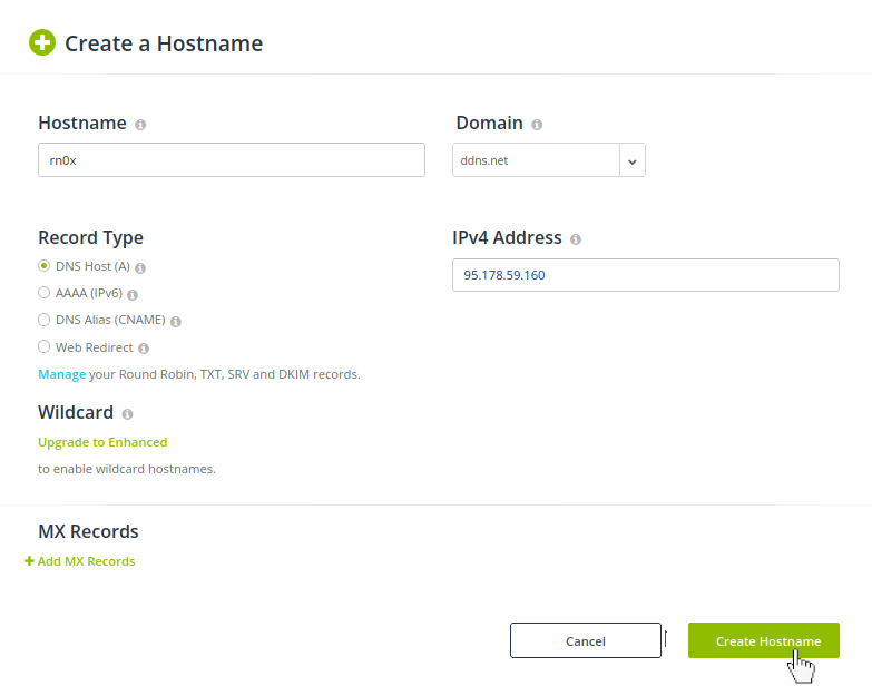 ثم أدخل اسم المضيف وقم بتعيين المجال ، ثم انقر فوق Create Hostname.