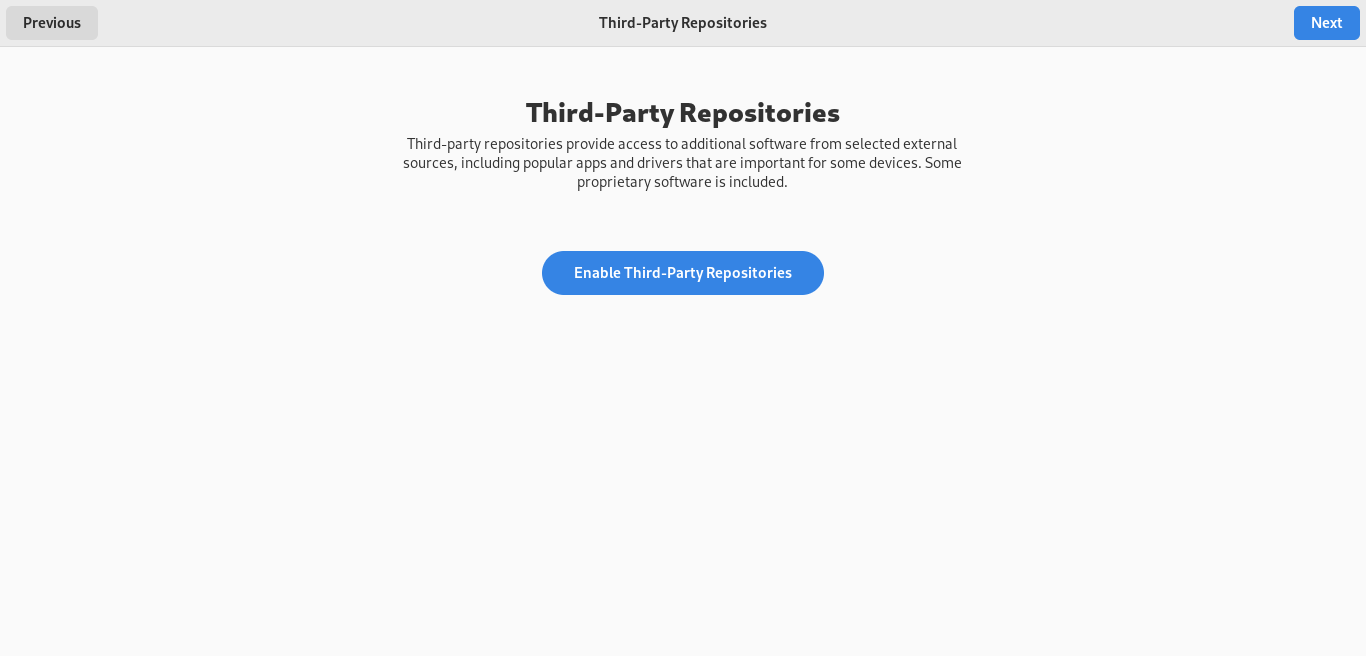 يمكن تفعيل مستودعات الطرف الثالث للحصول على حزم إضافية خاصة الحزم مغلقة المصدر حزم إنفيديا وستيم للألعاب ومستودع جوجل كروم وغيرها، يمكنك تخطي الأمر وتفعيله لاحقا من خلال مدير الحزم dnf أو متجر جنوم، ثم اضغط على Next.