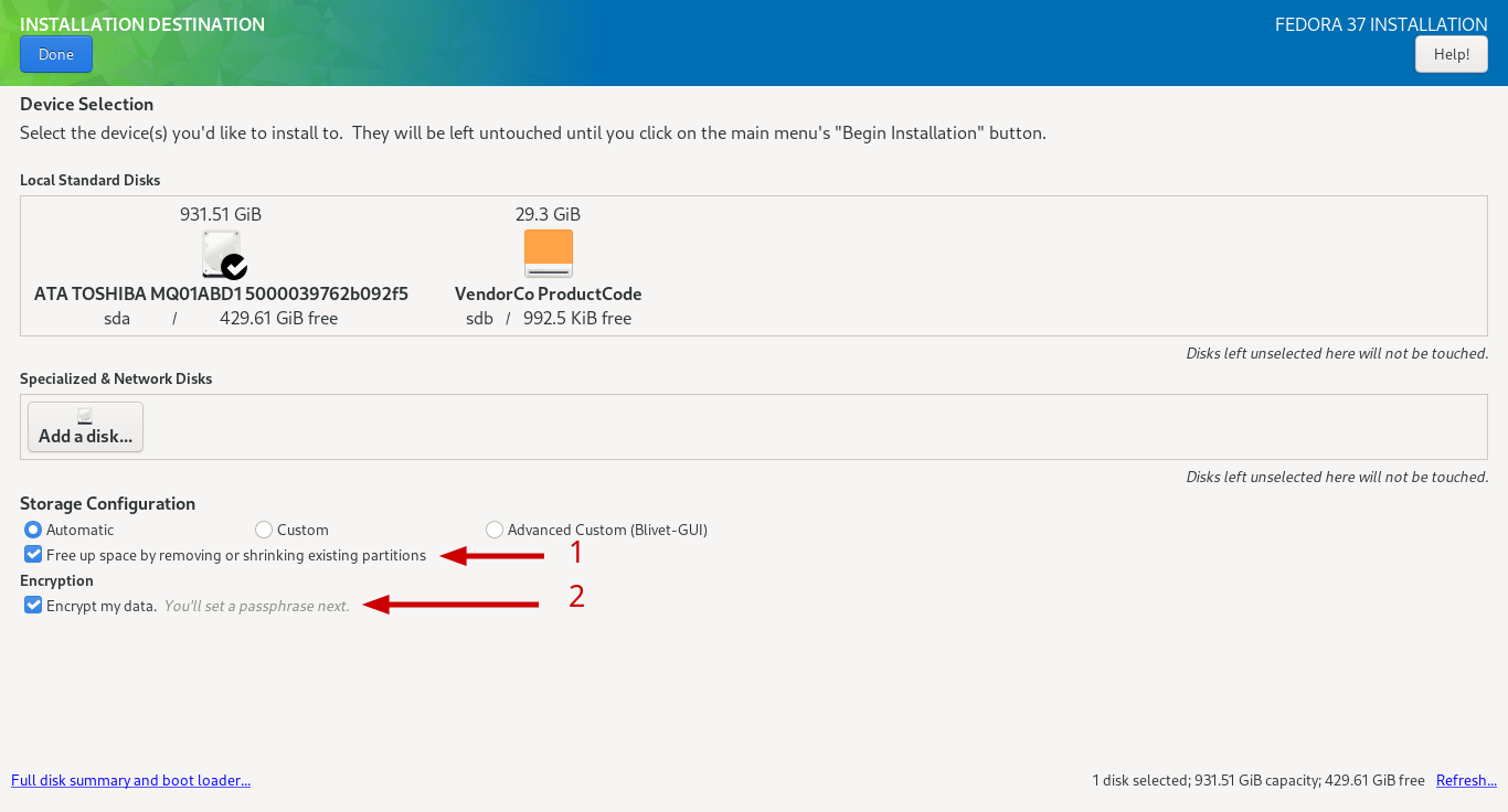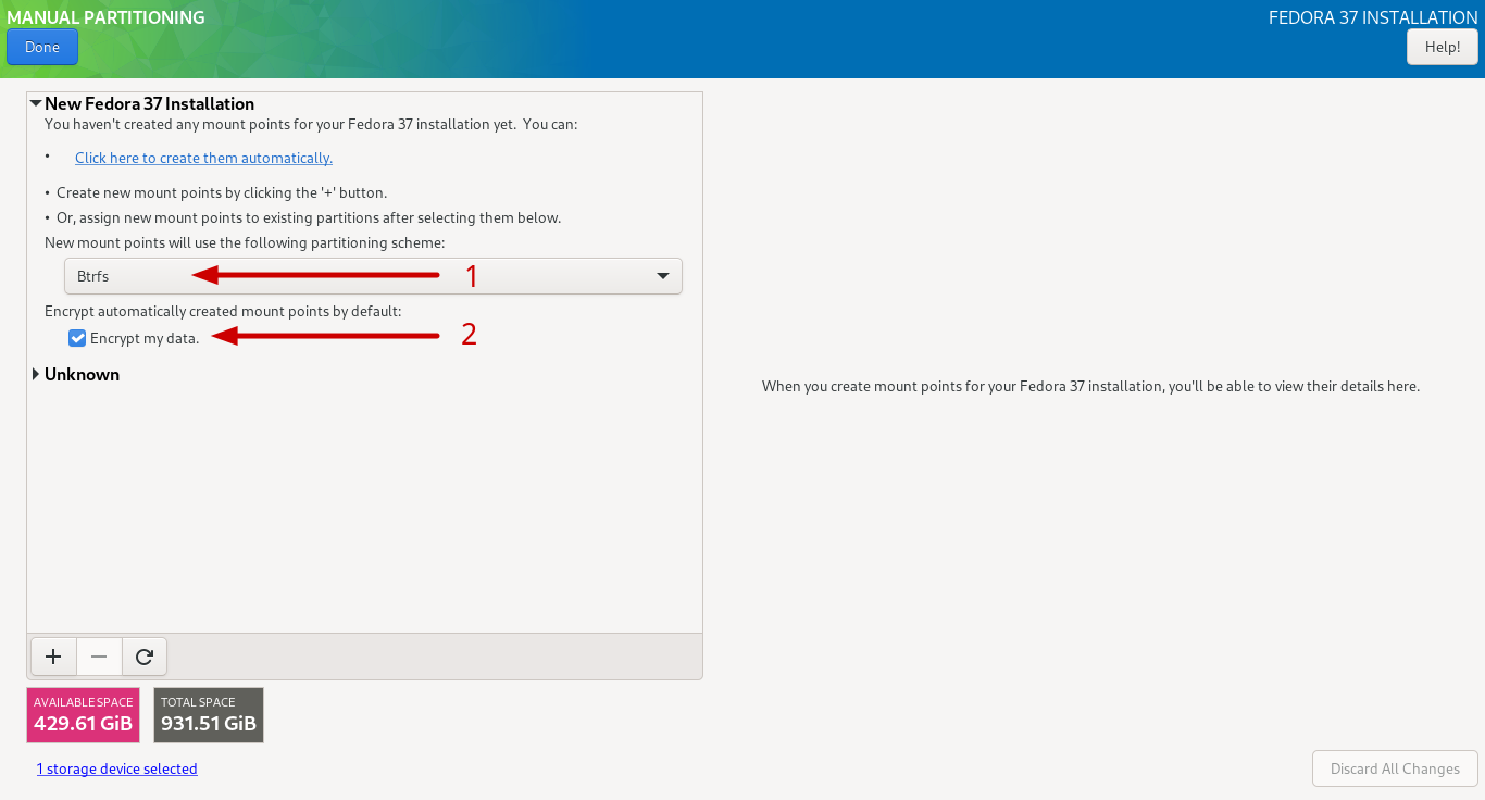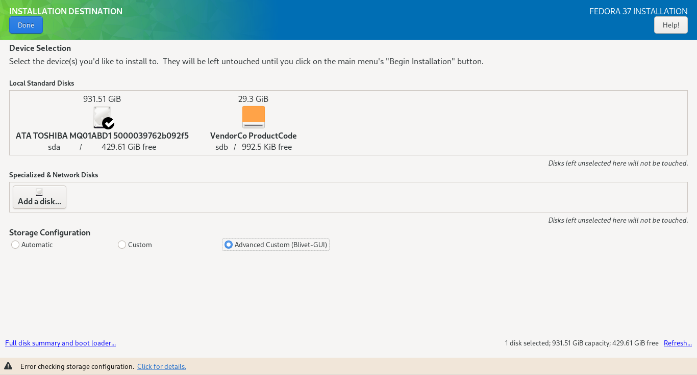 في العادة يفي نوع التثبيت الأول والثاني في معظم الحالات لكن فيدورا تقدم نوع تثبيت متقدم لبعض الحالات مثال لذلك من يريد قسمين منفصلين للجذر والمنزل بنظام ملفات Btrfs حيث أن التثبيت المخصص يجعلهما Subvolume في قسم واحد ولا تستطيع فصلهما.