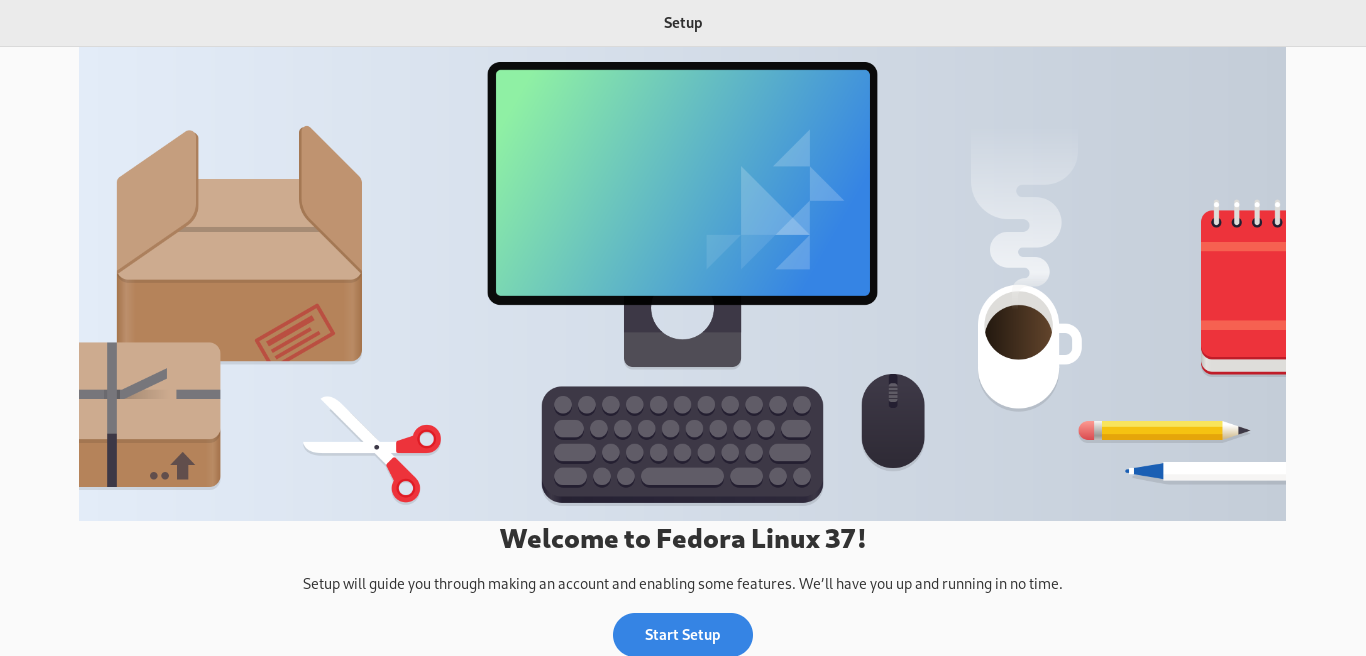 بعد تشغيل الجهاز تظهر نافذة جديدة لإعداد توزيعة فيدورا، نضغط على Start لبدأ الإعداد.