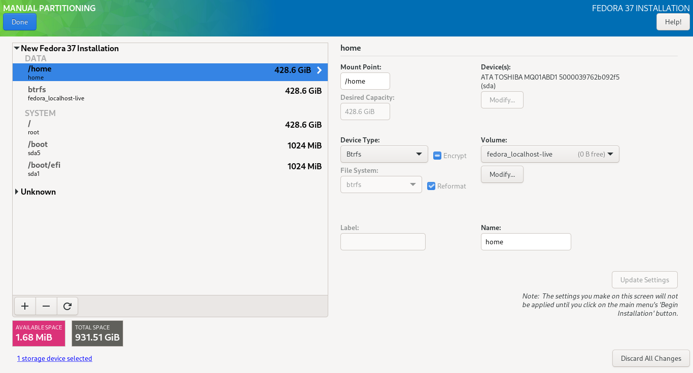 /وhome/بنظام ملفاتBtrfsحيث يكونانSubvolumeفي قسم واحد يأخذ المساحة المتبقية.