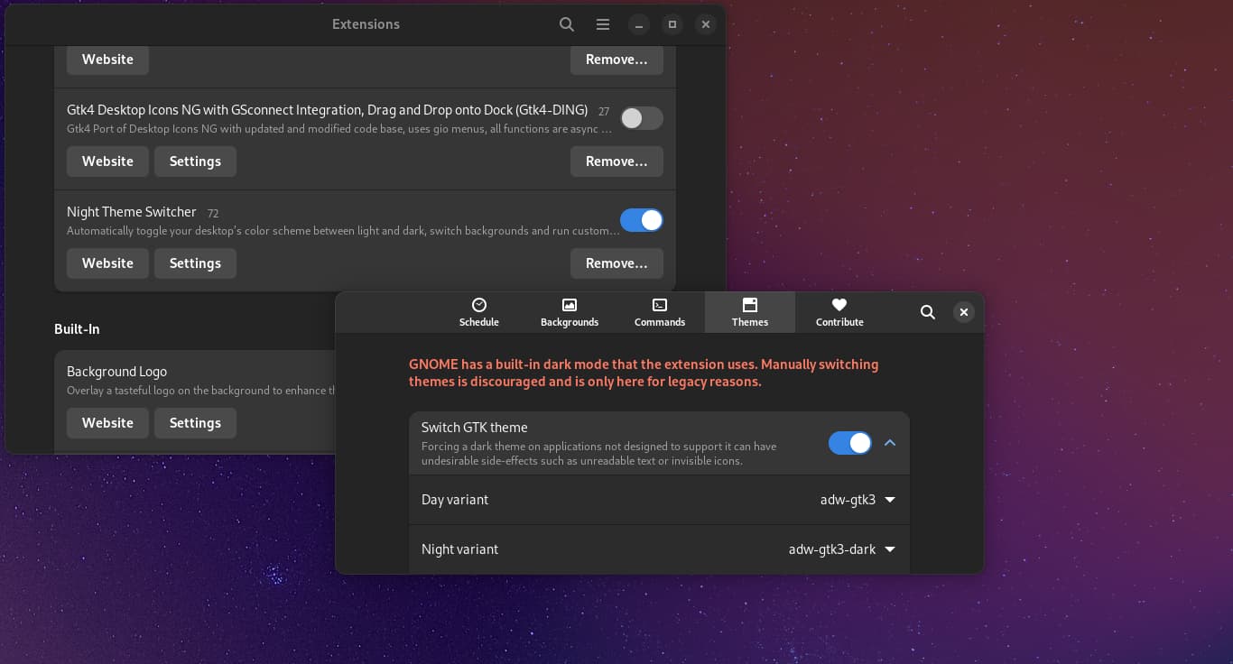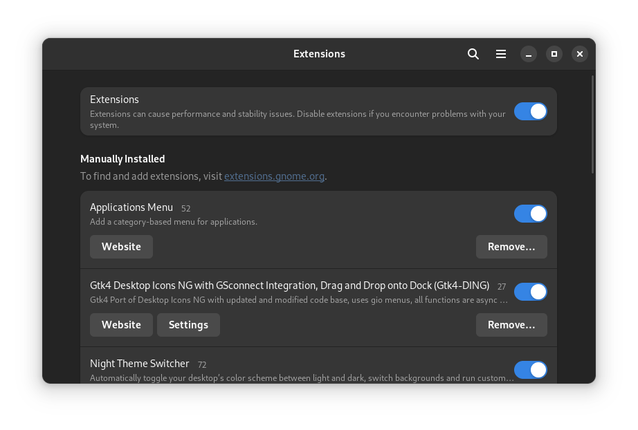 أما تطبيق Extensions App فيسمح لك بتفعيل و تعطيل وإعداد إضافات جنوم التي يمكنك تصفحها من موقع إضافات جنوم