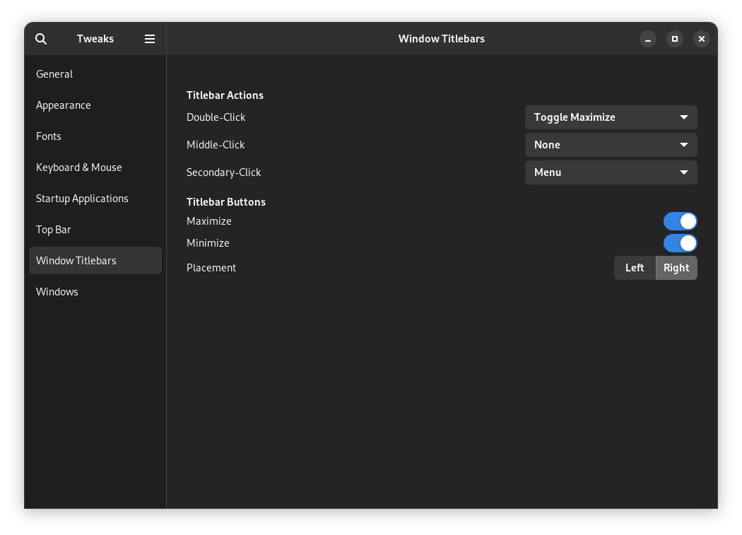يسمح تطبيق Gnome Tweaks بتعديل خطوط الواجهة وتفعيل زري التكبير والتصغير للتطبيقات أو تغيير سمة برامج GTK3 وغيرها من الأمور.