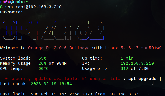- بعد الدخول على جهاز الـ orange pi عن طريق ssh قم بتحديث وترقية الحزم