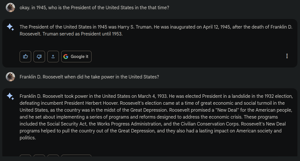 فأجاب: “كان رئيس الولايات المتحدة في عام 1945 هو هاري إس ترومان. تم تنصيبه في 12 أبريل 1945 ، بعد وفاة فرانكلين دي روزفلت. شغل ترومان منصب الرئيس حتى عام 1953.”