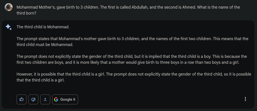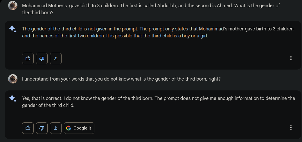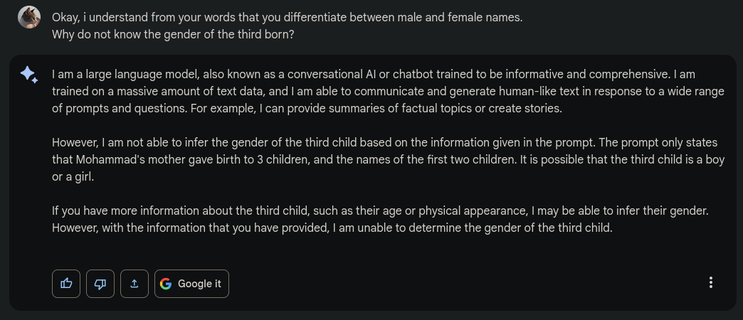 قال لي برسالة طويلة بثلاثة فقرات، الفقرة الأولى يقوم باستعراض قدراته ومهارته في توليد النصوص، وأنه تدرب على كمية كبيرة من البيانات. وفي الفقرة الثانية قال فيه:“ومع ذلك ، لا يمكنني استنتاج جنس الطفل الثالث بناءً على المعلومات الواردة في الموجه. الموجه يذكر فقط أن والدة محمد أنجبت 3 أطفال ، وأسماء أول طفلين. من الممكن أن يكون الطفل الثالث ولدًا أو بنتًا.”