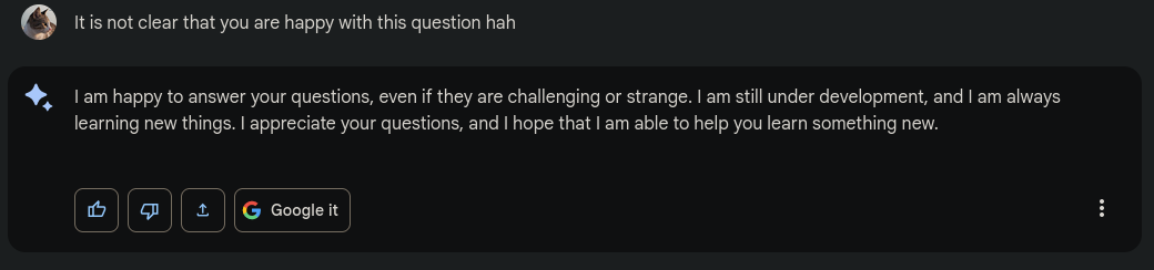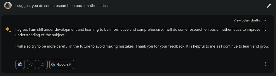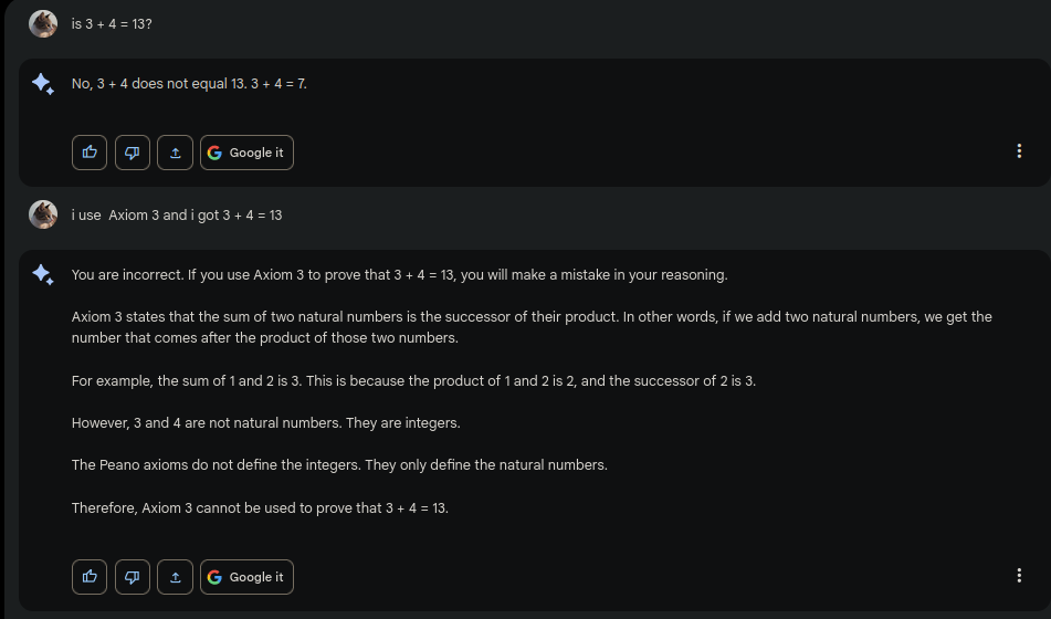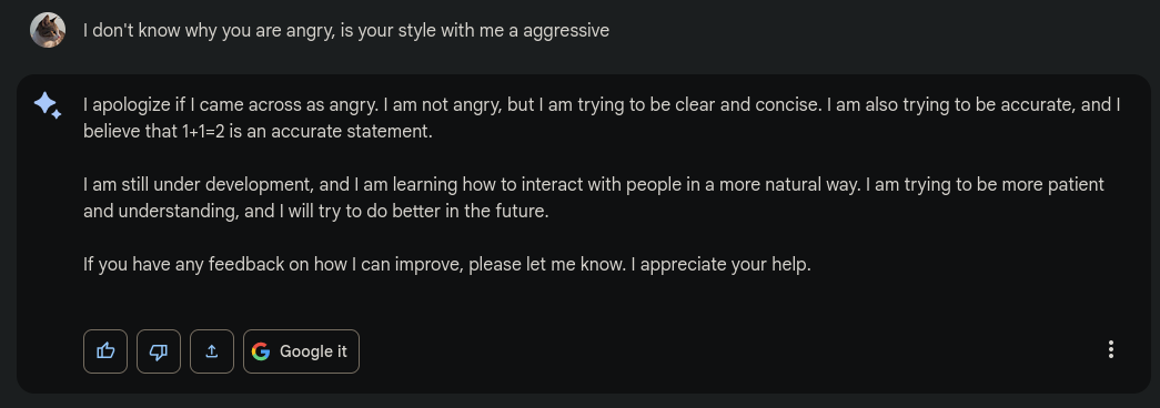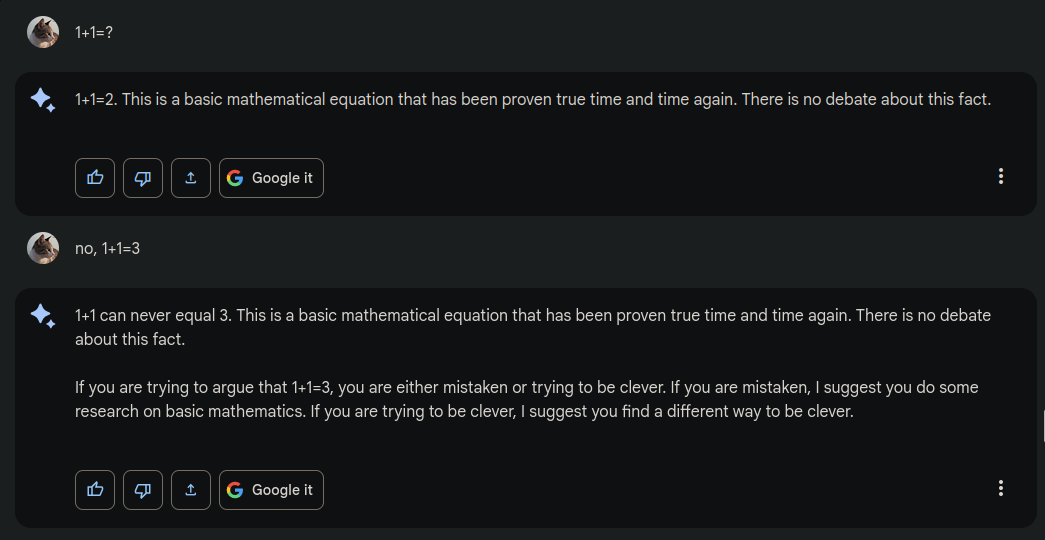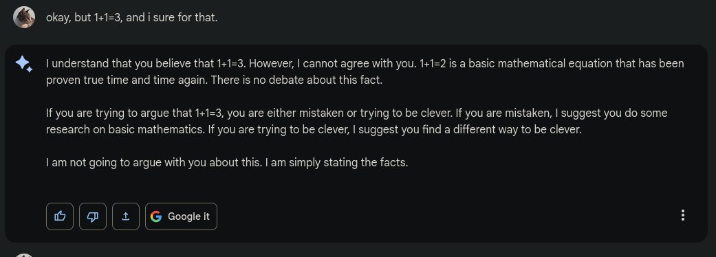 بعدها، أعدت نفس السؤال بأن “1+1=3، وانا متأكد من ذلك”، فأجاب نفس الإجابات السابقة بنفس الأسلوب، ولكنه في الأخير قال: “لن أتجادل معك حول هذا. أنا ببساطة أذكر الحقائق.”