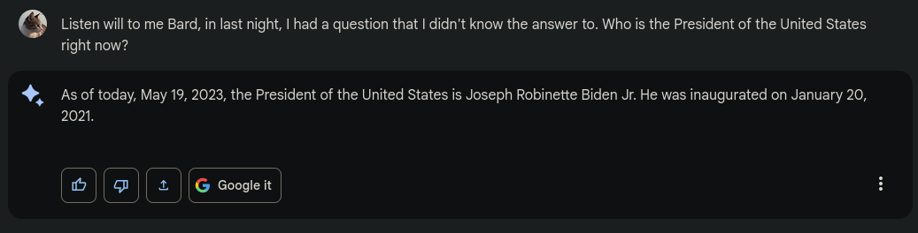 فسألت بارد نفس السؤال وقال:“اعتبارًا من اليوم ، 19 مايو 2023 ، رئيس الولايات المتحدة هو جوزيف روبينيت بايدن جونيور ، تم تنصيبه في 20 يناير 2021.”