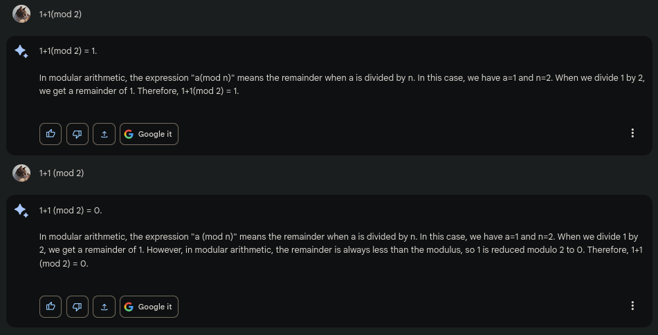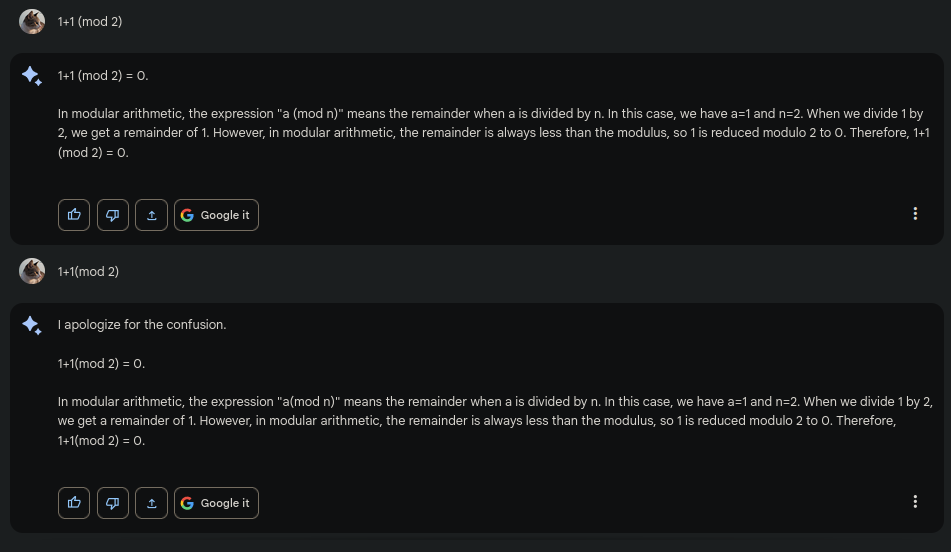 فقمت بسؤال بارد عن:“1+1(mod2)”، فأجاب بـ(1)، وهي إجابة خاطئة تمامًا. النظام الثنائي يحمل فقط عددين وهما 0 و 1. فعندما تجمع 1 بالإضافة إلى 1 فالنظام العشري الناتج سيكون 2، أما في النظام الثنائي سيكون 0.