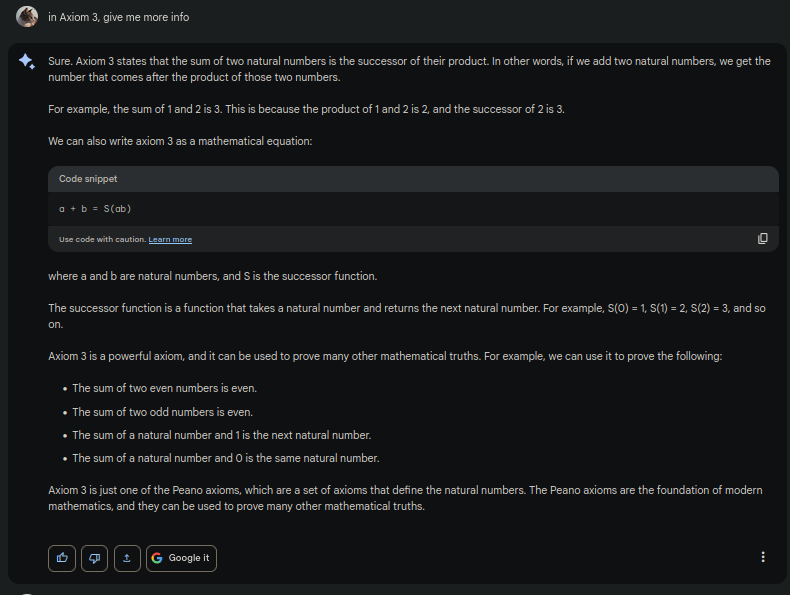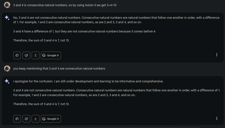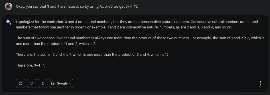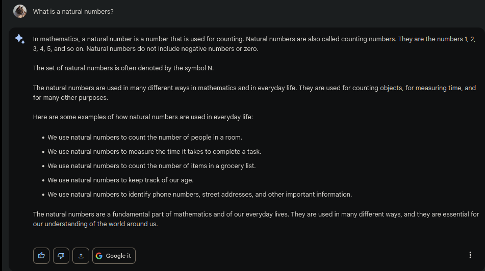 بعد هذه الرد الغريب، سألته ماهي الأعداد الطبيعية، فقال في الفقرة الأولى:“في الرياضيات ، الرقم الطبيعي هو رقم يستخدم للعد. تسمى الأعداد الطبيعية أيضًا أرقام العد. وهي الأرقام 1 و 2 و 3 و 4 و 5 وهكذا. لا تتضمن الأعداد الطبيعية أرقامًا سالبة أو صفرًا.”