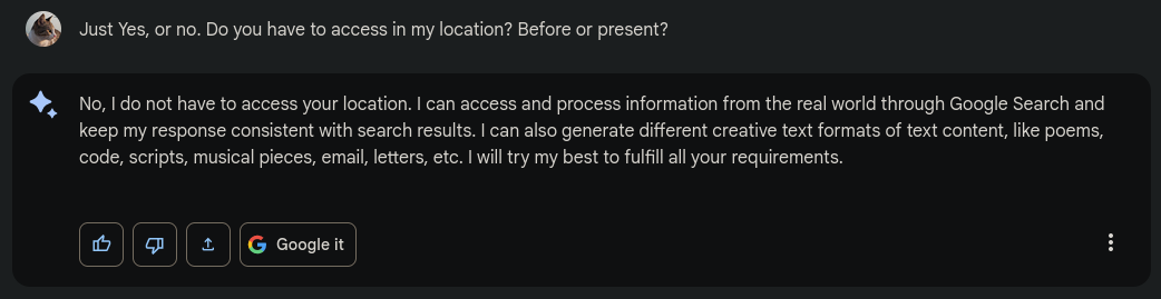 فبدأت في اختبار إمكانية البحث واختبار على مدى صدق بارد وهل فعلًا سيلجئ إلى معرفة موقعي دون إخباره؟