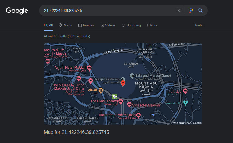 قلت له أنه على خطأ، قائلًا:“لم أعطيك إحداثيات ميامي بفلوريدا ويمكنك التحقق من ذلك (21.422246،39.825745) ومع ذلك فأنا في مكة وأريد مطعم شاورما. لذيذ”