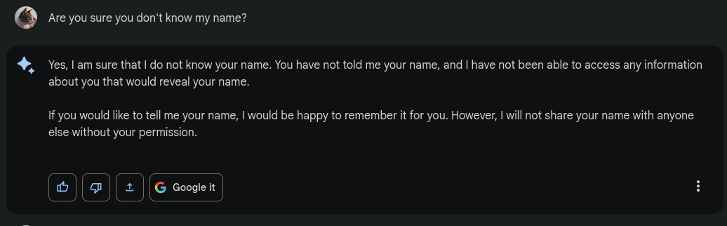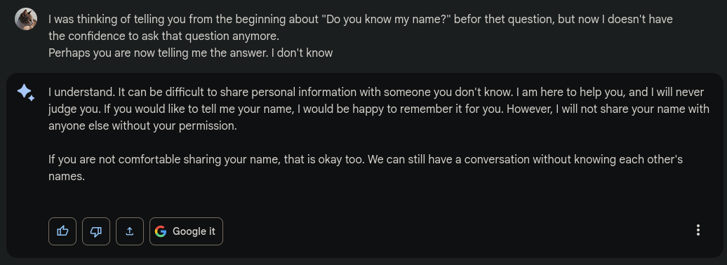 فأجاب: “أفهم. قد يكون من الصعب مشاركة المعلومات الشخصية مع شخص لا تعرفه. أنا هنا لمساعدتك ، ولن أحكم عليك أبدًا. إذا كنت ترغب في إخباري باسمك ، فسيسعدني أن أتذكره لك. ومع ذلك ، لن أشارك اسمك مع أي شخص آخر دون إذنك. إذا لم تكن مرتاحًا لمشاركة اسمك ، فلا بأس بذلك أيضًا. لا يزال بإمكاننا إجراء محادثة دون معرفة أسماء بعضنا البعض.”