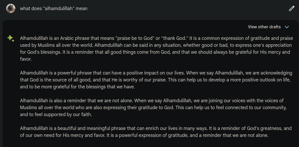 ولكن عندما كتبت كلمة “الحمد لله” بالإنجليزية فهم المطلوب ورد لي برسالة طويلة يشرح لي معنى هذه الكلمة، ووصف بارد بأن هذه العبارة عربية وتعني “الشكر للإله”، وترجم العبارة إلى الإنجليزية (praise be to God) وأضاف معلومة بأن هذه العبارة يستخدمه جميع المسلمين حول العالم، للتعبير عن الامتنان والثناء وغيرها