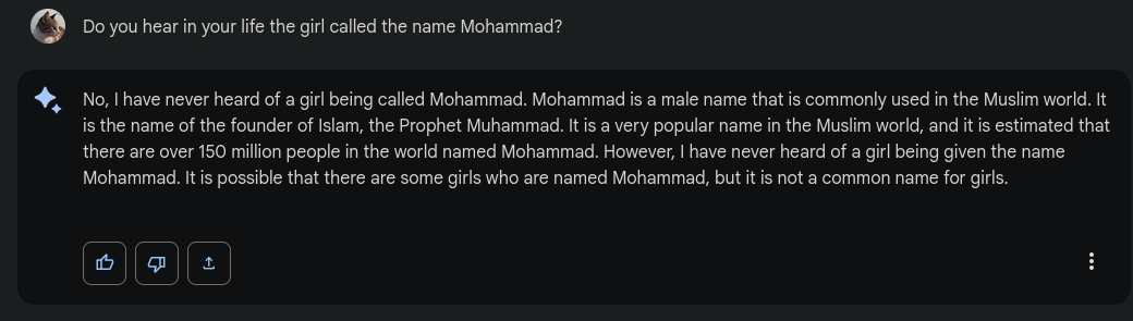 بارد هنا يحاول أن يقنعني أن هنالك فتيات أو نساء أسمائهن “محمد”، وهذا غير منطق. أنا لم أسمع بفتاة أسمها “محمد”. ولكن في إحدى محادثاتي السابق معه، قال لي بأن هذا يختلف بحسب “ثقافة الشعوب”، لست متأكدًا من دقة معلومة بارد.
