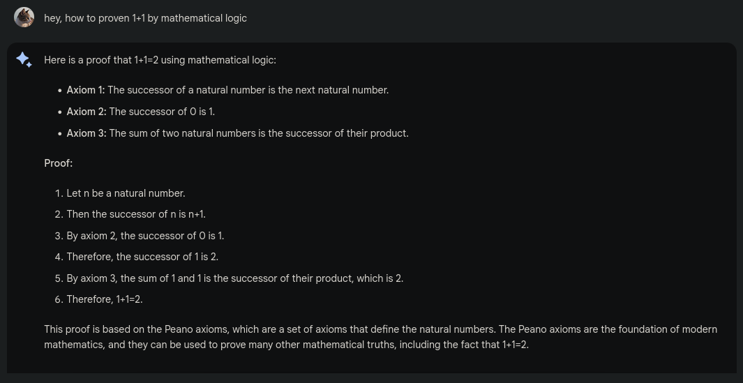 ولكن هذا لم يكن مقنعًا بالنسبة لي. فطلبت منه أن يثبت 1+1 عن طريق المنطق الرياضي، فرد علي بثلاثة بالبديهيات أو بالإنجليزية (Axiom):