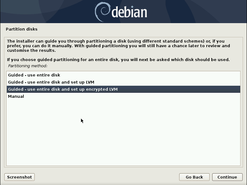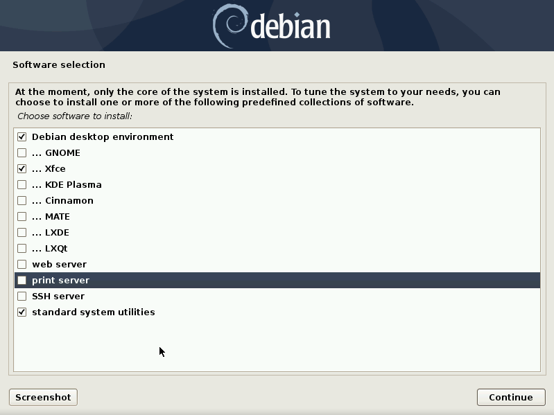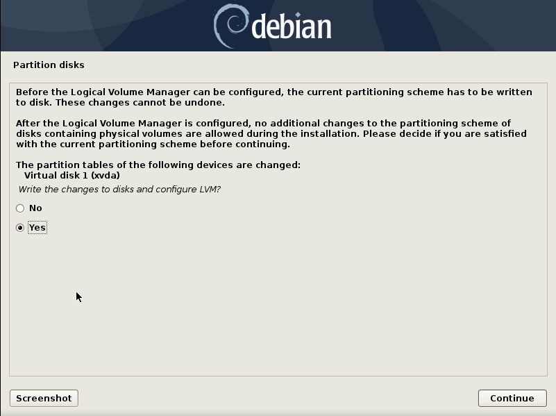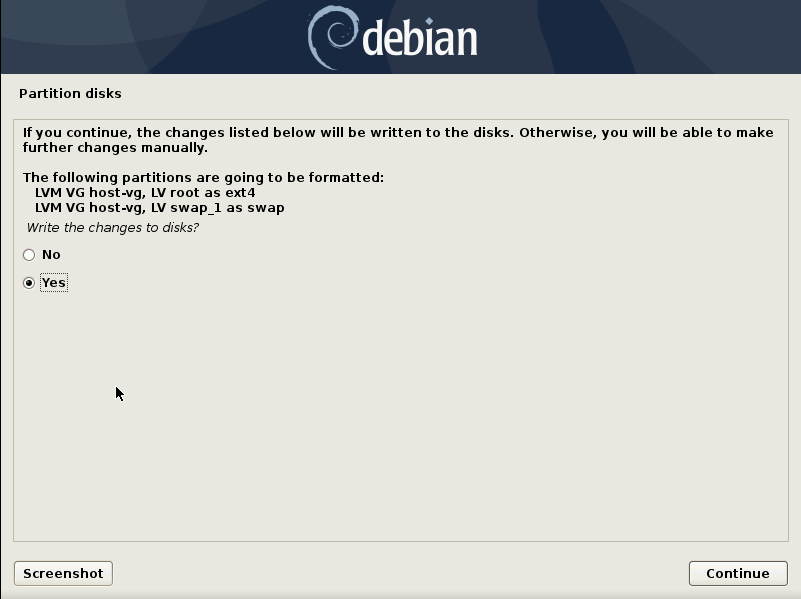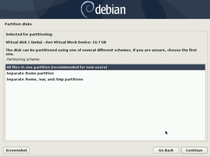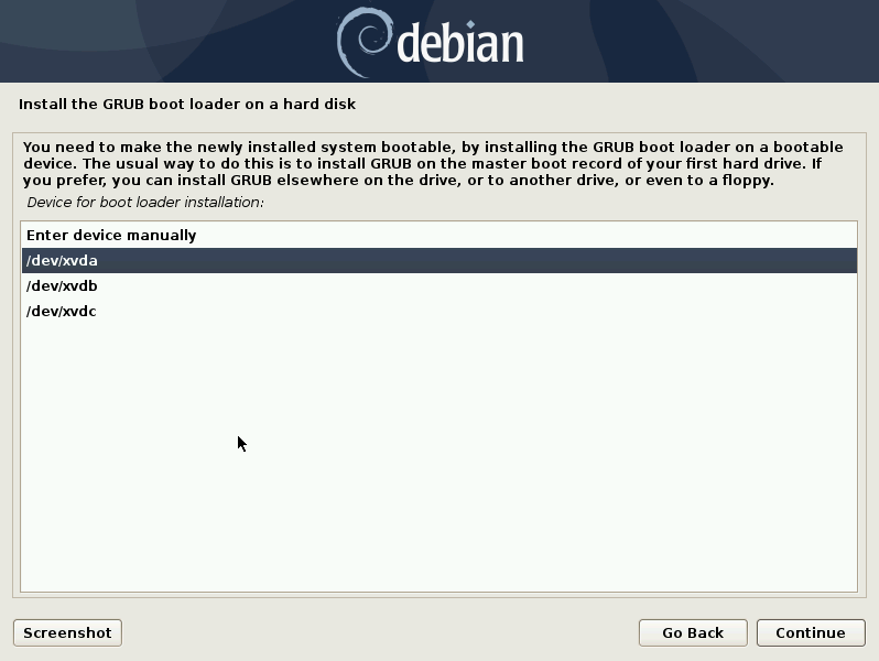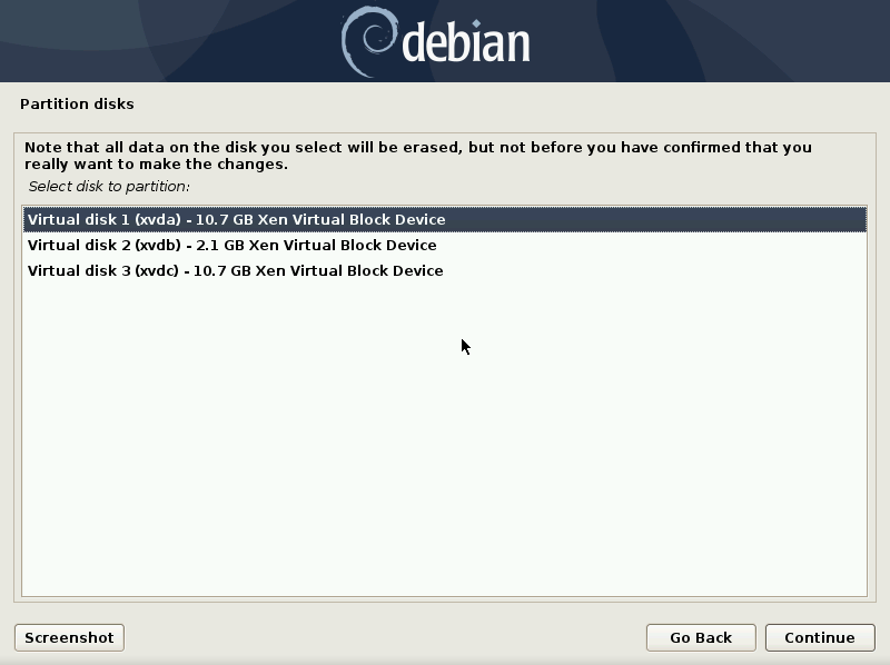 - ثم اختر القسم الذي قمت بتنصيب ديبيان عليه (في حاله كان قسم واحد فقط فاختره) ثم Continue
