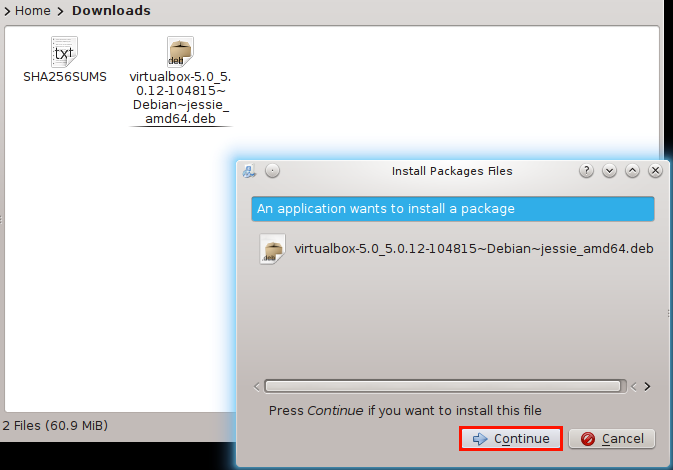 - ثم نذهب الى مكان تخزين الvirtualbox وننقر عليه ثم نختار continue (ويتم تنصيبه حاله من حال اي برنامج عادي)