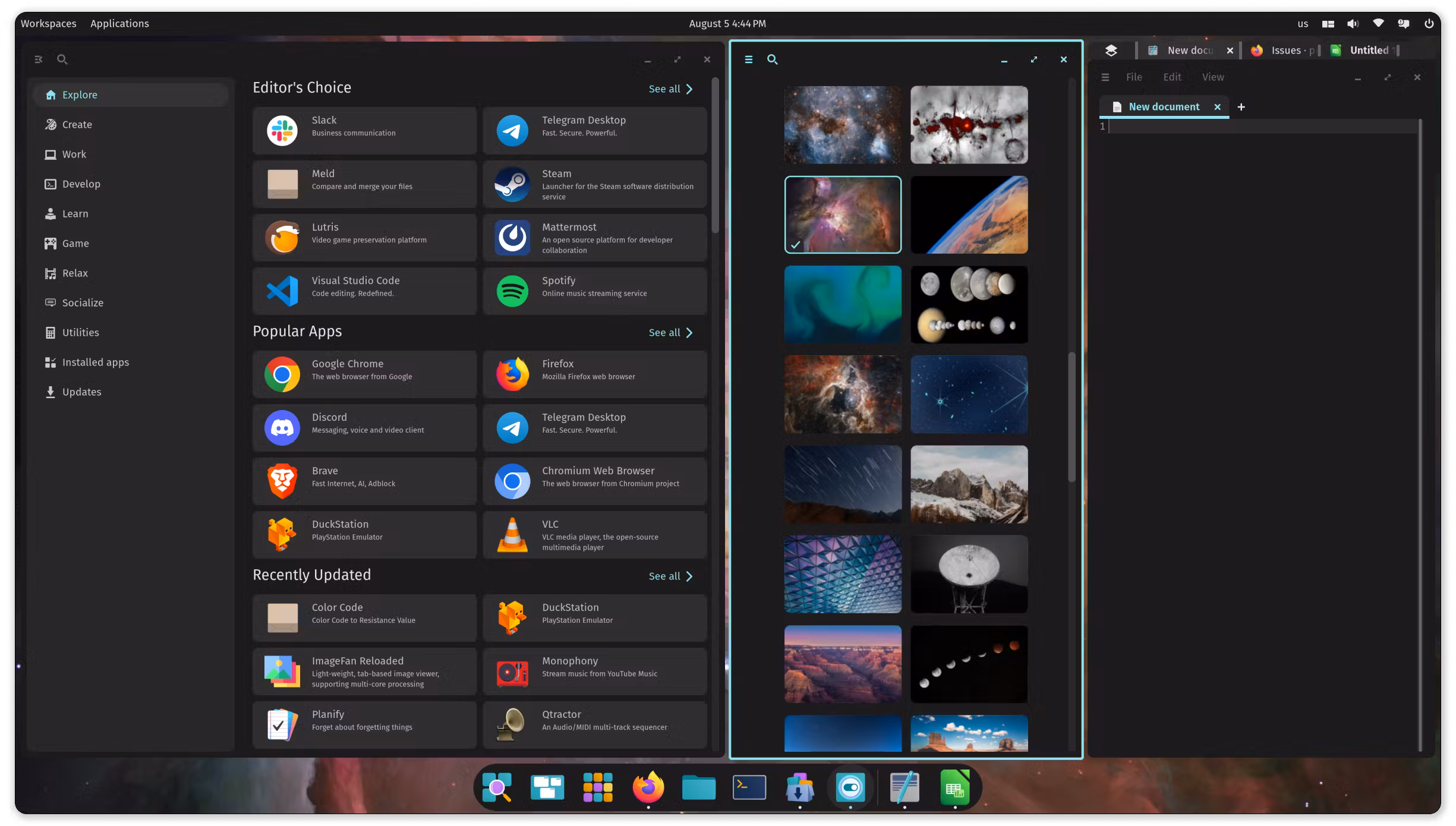 مكتبة التطبيقات: لفتح التطبيقات وتنظيمها في مجلدات مخصصة لسير العمل حيث تتضمن التطبيقات الأساسية للواجهة مثل مدير الملفات والإعدادات والمحطة الطرفية ومحرر النصوص ومتجر التطبيقات.
