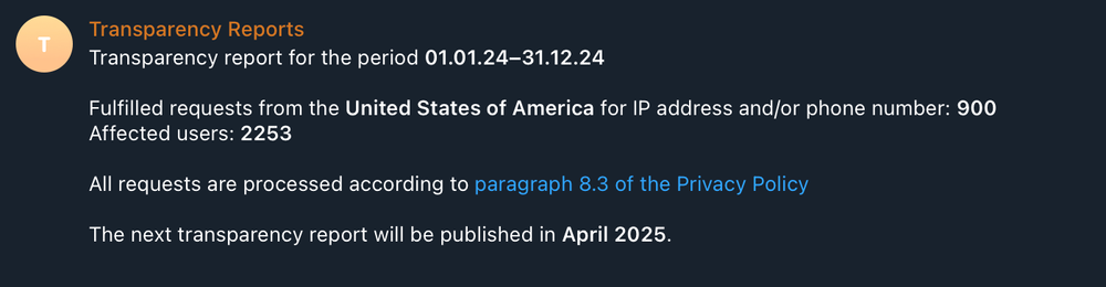 “الطلبات التي تم تلبيتها من الولايات المتحدة الأمريكية للحصول على عنوان IP و/أو رقم الهاتف: 900”، هكذا قال برنامج تقارير الشفافية في تيليجرام عندما طُلب منه تقديم التقرير الأخير من 404 Media. وأضاف: “المستخدمون المتأثرون: 2253”.