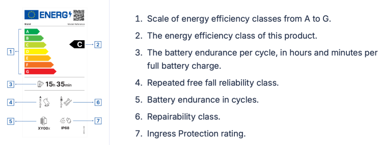 سيُطلب من جميع الهواتف الذكية (بما في ذلك الهواتف العادية)، والهواتف اللاسلكية الأرضية، والأجهزة اللوحية (بشاشات تتراوح بين 7 و 17.4 بوصة) التي تُطرح في سوق الاتحاد الأوروبي بعد 20 يونيو 2025 أن تحمل ملصقًا جديدًا داخل العبوة[1:1][2:1][4:2].