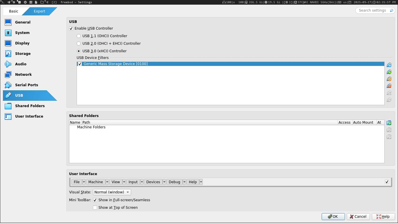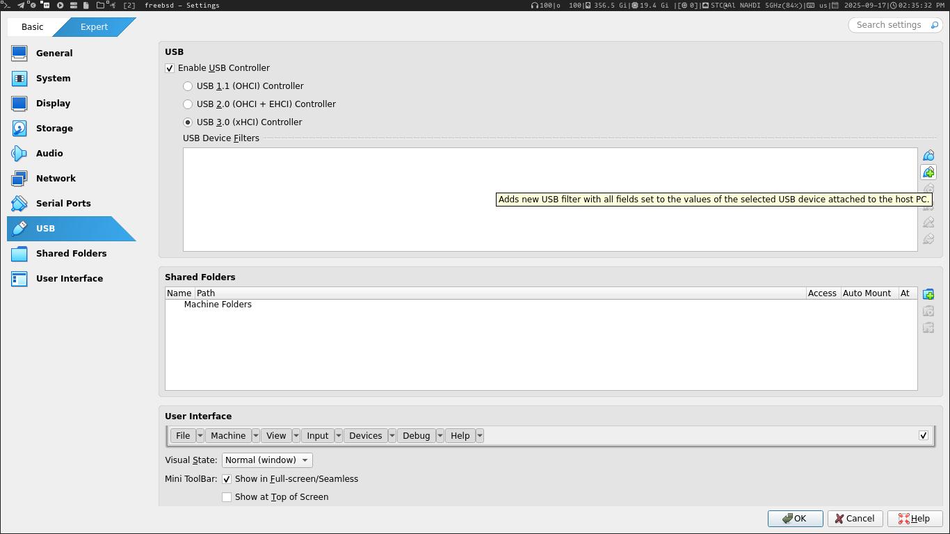 قبل تشغيل المكينة الإفتراضية ادخل SD و ثم من الإعدادات اضف الـ USB
