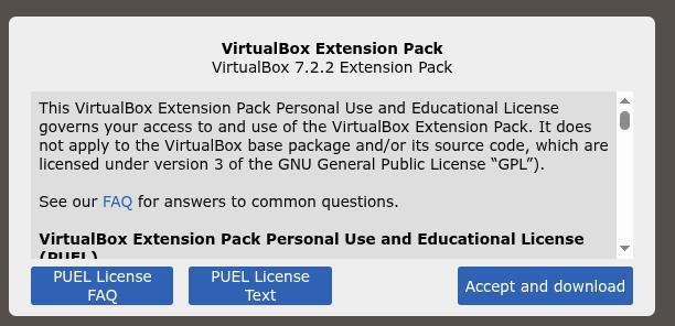 sudo VBoxManage extpack install Oracle_VM_VirtualBox_Extension_Pack-7.2.2.vbox-extpack