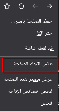 إذا صادفت موقع فيه نصوص عربية لكن الموقع لا يدعم الاتجاه اليمين إلى اليسار، يمكنك النقر على الزر اليمين في الفأرة واختيار خيار “اعكس اتجاه الصفحة”