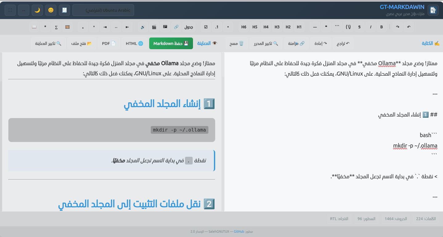 بكل فخر وسرور، نعلن عن الإصدار الثاني من GT-MARKDAWIN — محرر ماركداون متكامل صُمم خصيصًا لتلبية احتياجات الكتّاب والمطورين الناطقين بالعربية، مع دعم كامل لاتجاه النص من اليمين إلى اليسار (RTL).