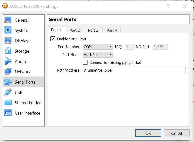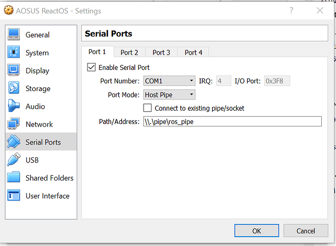 في مربع الحوار الخاص ب Path/Address ( ملاحظة لديك إمكانية تغيير إسم ros_pipe بأي اسم آخر، ولكن من الأفضل تركه كما هو؛ لكي لا تواجه مشاكلًا في باقي الخطوات ), الآن نقوم بحفظ الإعدادات الخاصة بالآلة الافتراضية ثم نقوم بإعداد Com0com لكي يتناسق مع Putty.
