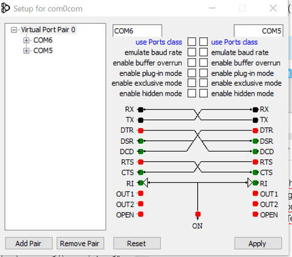 بعدما قمنا بتثبيت Com0com نقوم بفتح تطبيق setup الخاص به، وعمل إعداداته كالتالي: