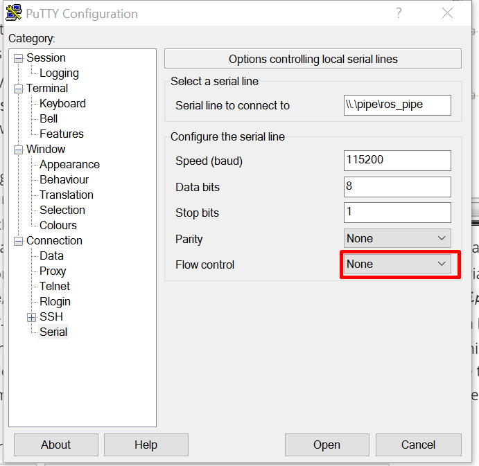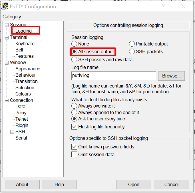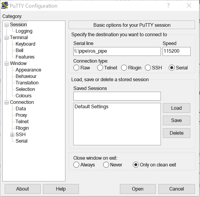 نقوم باختيار Serial في قائمة Connection Type ونقوم بكتابة : .\pipe\ros_pipe في مربع الحوار الخاص ب Serial line ونجعل قيمة Speed تكون 115200، ثم نقوم بالإنتقال إلى Logging في قائمة Session على اليسار، ونجعل إعداداتها هكذا: