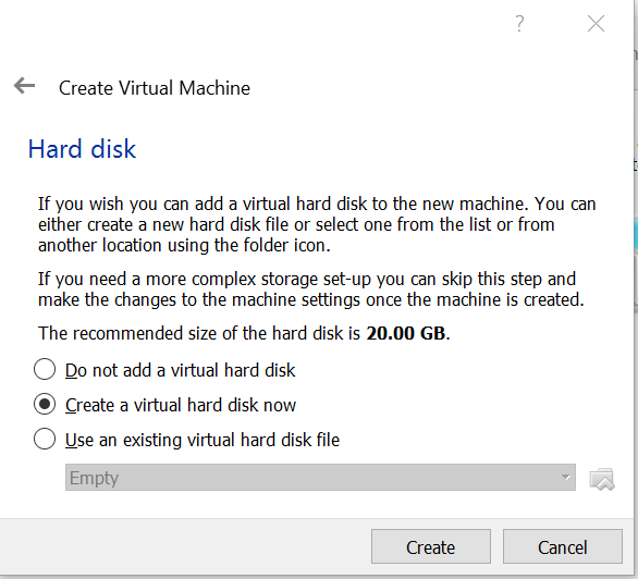 الآن بعدما قمنا بعمل الإعدادات نقوم بإنشاء الآلة الافتراضية Virtual Machine عن طريق زر Create أو إنشاء.