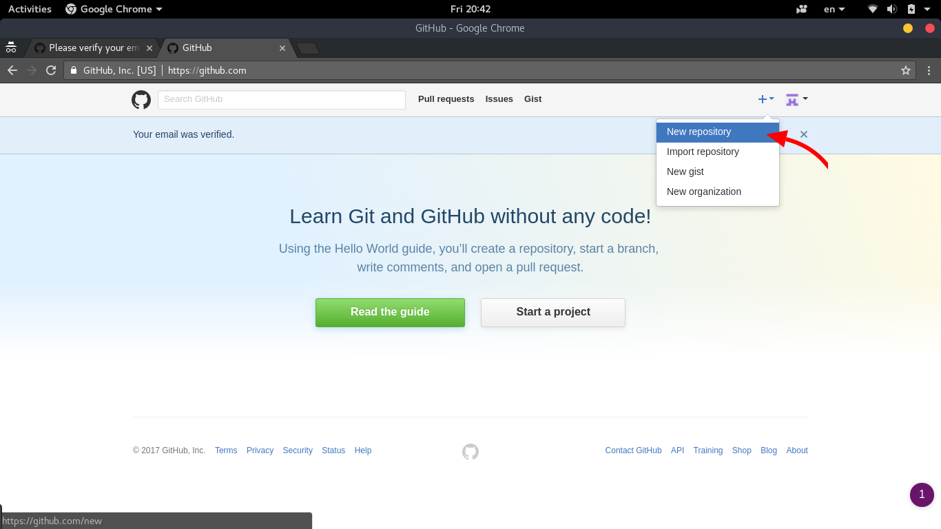 بعد الضغط علي رابط التفعيل من بريدك ستتوجه الي موقع “غيت هب” واختر كما في الصورة التالية وهي عبارة عن انشاء مستودع جديد